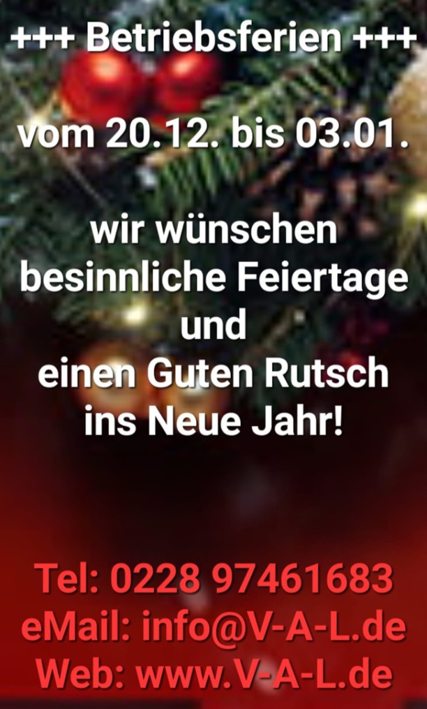VAL hat vom 20.12. bis 03.01. Betriebsferien: Wir wünschen Ihnen besinnliche Feiertage sowie einen Guten Rutsch ins Neue Jahr